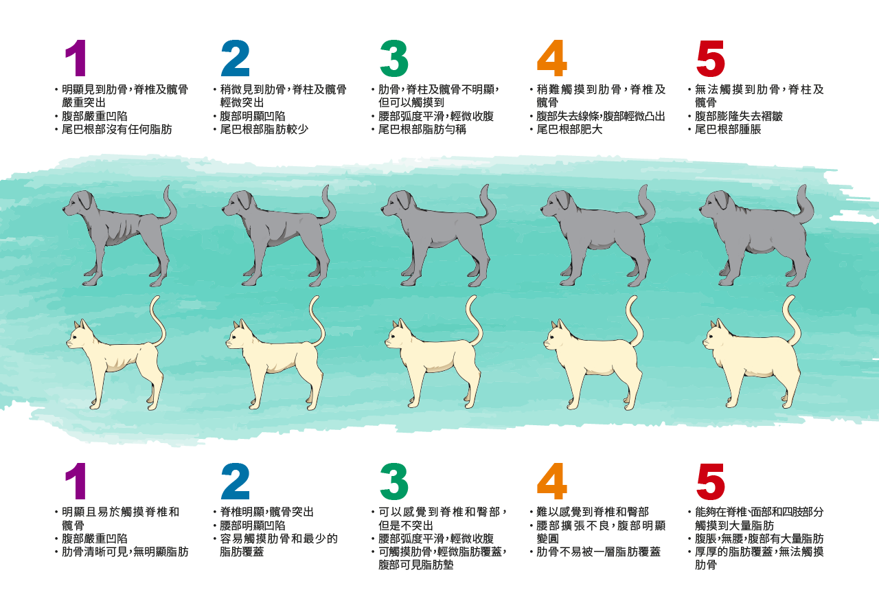 評估寵物體重過輕或超重可使用以下三種方法: